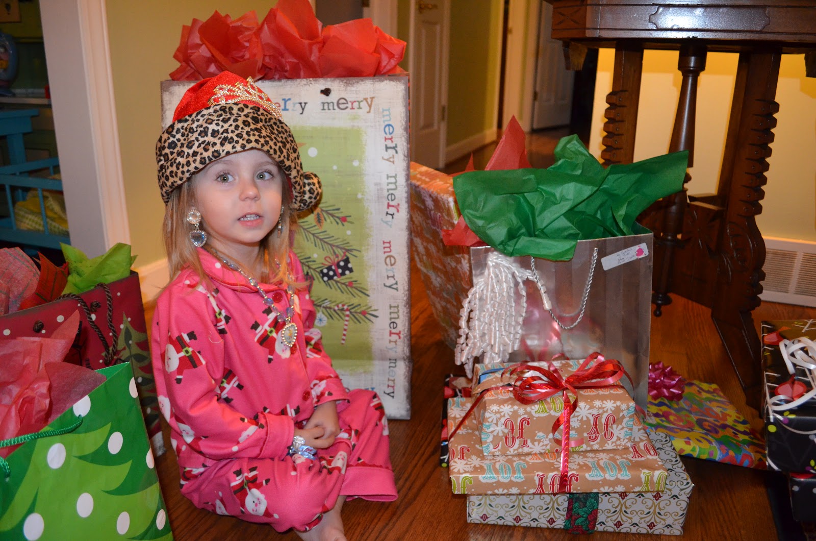 After Santa gifts, Big Poppy came over and we did our family Christmas. For tradition's sake, we all donned our festive headwear, passed out gifts and got down to business! Nana found Nora a Santa hat with a tiara this year..very appropriate ;)